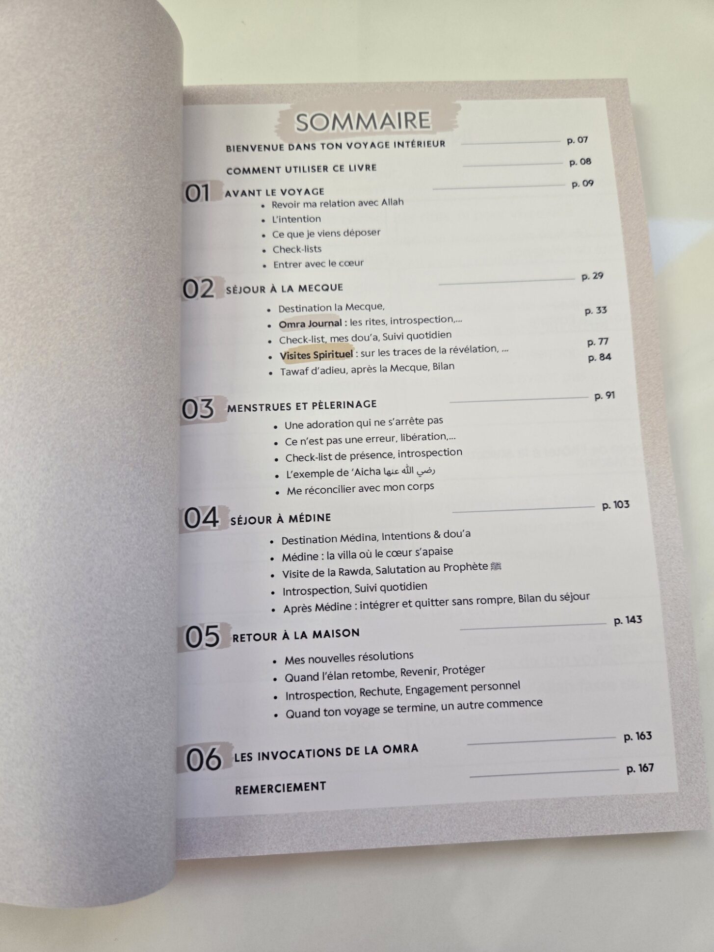 6 Chapitres : Avant le voyage, Séjour à la Mecque (avec la partie Omra et Visites Spirituelle), Menstrues et Pèlerinage, Séjour à Médine, Retour à la Maison, Les invocations de la Omra